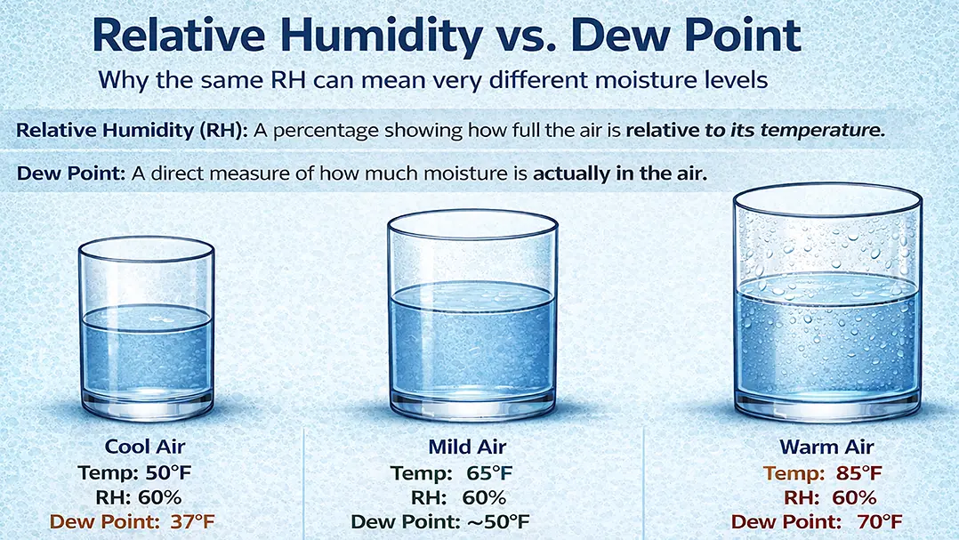 To understand moisture behavior accurately, we have to look beyond RH and focus on dew point. Dew point represents the actual amount of moisture in the air and offers insight that RH simply cannot. This makes dew point the more reliable way to evaluate drying potential, ventilation decisions, and long-term moisture protection.